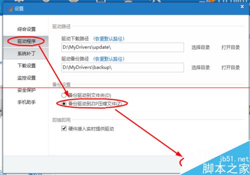 3、在【綜合設(shè)置】界面下,點(diǎn)擊選擇【驅(qū)動(dòng)程序】-->【硬件接入時(shí)實(shí)時(shí)提供驅(qū)動(dòng)】-->【確定】選項(xiàng)完成操作。(如圖所示)