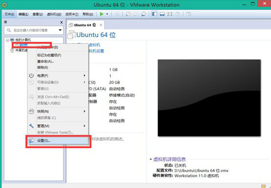 2.打開虛擬機,找到unbutu,右鍵“設置”,如圖所示。