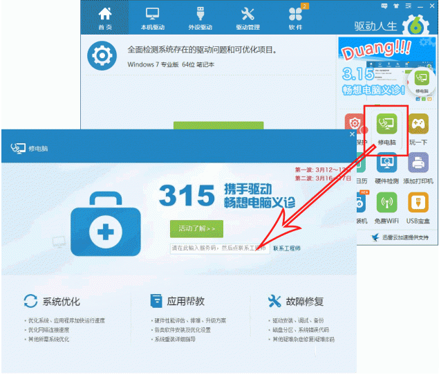 (4)下載驅動人生-修電腦-315電腦義診入口-輸入服務號-享受電腦義診服務;