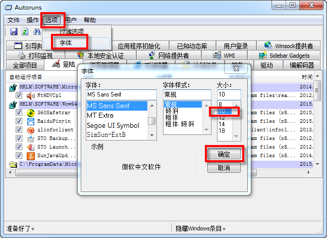 2、選項--勾選“隱藏微軟項目”--按菜單欄下常用工具欄的“刷新”按鈕,排除不必要的正常自啟動項目;