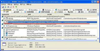 “登陸”- -細心的朋友可以發現,該標簽下HKLMSOFTWAREMicrosoftWindowsCurrentVersionRun、HKCU SoftwareMicrosoftWindowsCurrentVersionRun這兩個注冊表子項的內容與系統配置實用程序“啟動”標簽下打勾的項目是完全一樣的,甚至“登陸”的圖標也和系統配置實用程序MSCONFIG.EXE的圖標完全相同,呵呵!當然,除了以上項目外,該標簽還包括 HKLMSystemCurrentControlSetControlTerminal ServerWdsrdpwdStartupPrograms、HKLMSOFTWAREMicrosoftWindows NTCurrentVersionWinlogonUserinit、HKLMSOFTWAREMicrosoftWindows NTCurrentVersionWinlogonShell這三個自啟動子項的內容,這些是用系統配置實用程序“啟動”標簽看不到的內容。