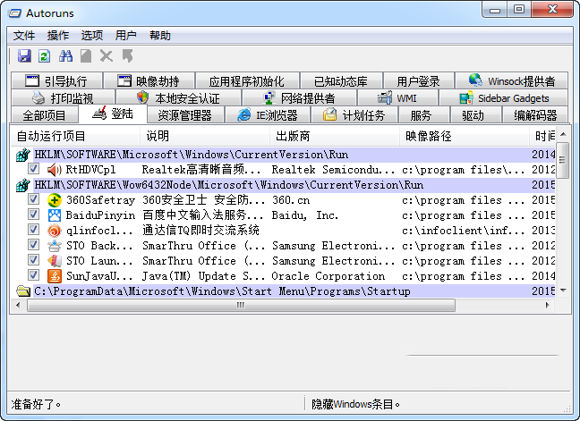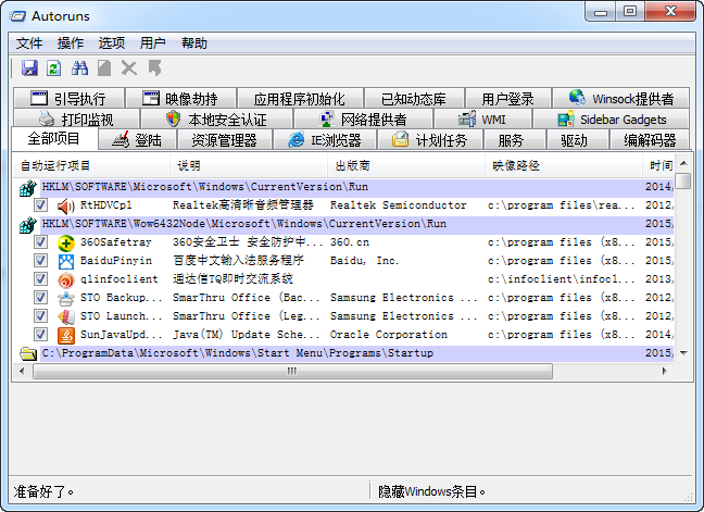 “全部”--顧名思義,全部的開機自啟動項都在這個標簽下啦。另外,它也是雙擊autoruns.exe彈出窗口缺省定位的標簽,包括其他標簽的所有內容。