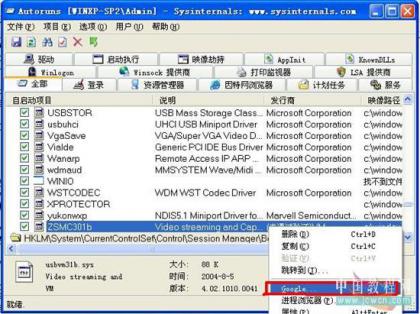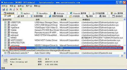 8、為了徹底不留后患,按照AUTORUNS提供的信息找到該映像文件(刪除ZSMC301B這個自啟動項前可以在其項目條上右鍵,選擇“復制”,將復制內容粘貼到寫字板或記事本中,以便刪除映像文件時查找該文件的路徑和文件名),刪除c:windowssystem32driversUSBVM31B.SYS這個文件。