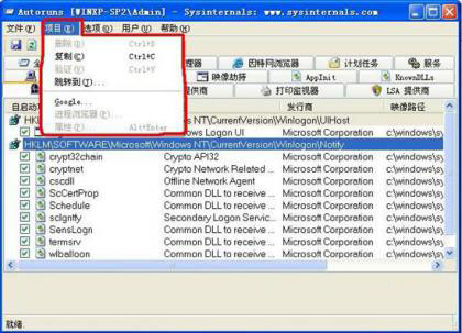 5、“搜索引擎”:有GOOGLE和MSN兩個子菜單項,選擇其中一個后,被選擇的就被作為AUTORUNS的默認搜索引擎,并直接在“項目”下拉菜單或在自啟動子項、自啟動值項點右鍵彈出菜單的第五項反映出來。