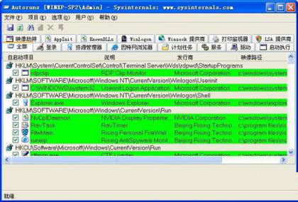 3、這時AUTORUNS將會對當前自啟動項同打開日志的自啟動項進行比較,對當前自啟動項如果比老日志多或者少,整個列表的項目將以綠色突出顯示!