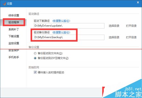 3、在打開的“設置”窗口中,切換到“驅動程序”選項卡,設置“驅動備份路徑”,點擊“確定”完成設置。之所以設置驅動備份路徑,是防止備份驅動程序的位置被系統所覆蓋。
