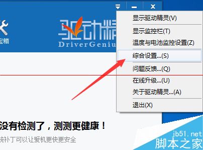 2、安裝并運行“驅動精靈”程序,在其程序主界面中點擊右上角的“設置“下拉列表,從中選擇“綜合設置”項。
