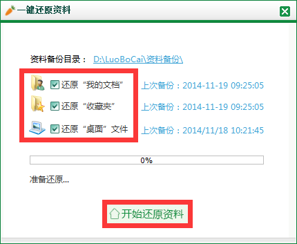 ② 一鍵還原資料:可以勾選你之前備份過的文件夾進(jìn)行還原,點(diǎn)擊“開始還原資料”即可完成資料還原。