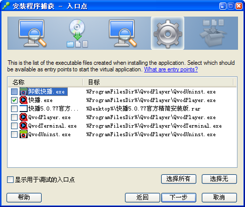 8、再次掃描結(jié)束后出現(xiàn)入口點(diǎn)窗口,開(kāi)始選擇快播運(yùn)行時(shí)的主程序文件(也就是生成的便攜版軟件運(yùn)行時(shí)的主程序文件)。注意,千萬(wàn)不要選錯(cuò)文件,否則生成的便攜版軟件無(wú)法運(yùn)行!選完后點(diǎn)擊“下一步”: