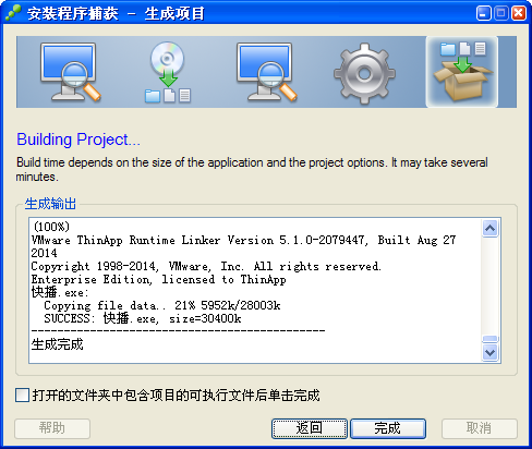 18、生成完成后出現(xiàn)此窗口,點(diǎn)擊“完成”按鈕, 便攜版快播就已經(jīng)制作完成,VMWare ThinApp會(huì)自動(dòng)退出。