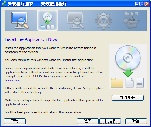 4、預(yù)掃描完成后,窗口顯示“Install the Application Now!”文字時(shí),表示VMWare ThinApp正在等待你安裝軟件。切記!此時(shí)不要點(diǎn)擊窗口的任何按鈕,電腦也不要進(jìn)行任何無(wú)關(guān)的操作,此窗口放著別動(dòng)!