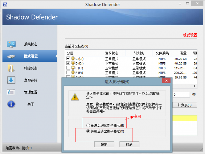 關(guān)機(jī)后推出影子模式:關(guān)機(jī)后Shadow Defender對(duì)C盤的影子保護(hù)將消失,這個(gè)時(shí)候和我們不安裝Shadow Defender使用電腦一模一樣,如果對(duì)C盤有任何修改,都會(huì)一直生效。