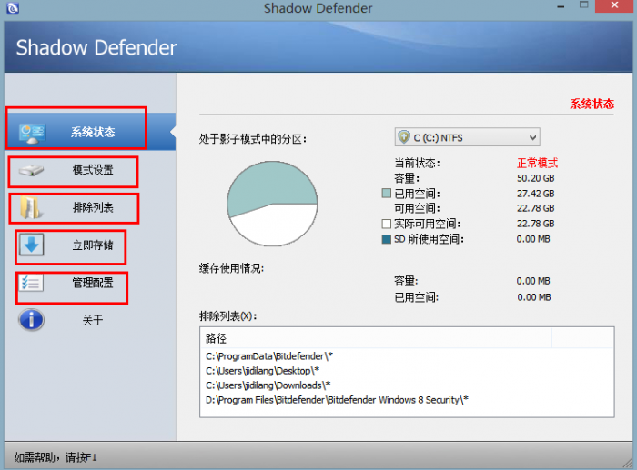 Shadow Defender這款影子系統(tǒng)界面簡(jiǎn)潔,操作容易,一般讀者都能自如使用。安裝完畢后,你會(huì)看到有幾個(gè)項(xiàng)目出現(xiàn)在Shadow Defender的左側(cè),系統(tǒng)狀態(tài)、模式設(shè)置、排除列表和立即儲(chǔ)存。