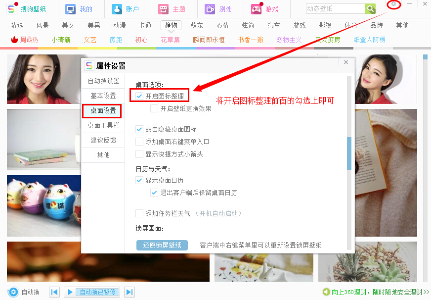 打開搜狗壁紙,找到設(shè)置--桌面設(shè)置,將桌面選項(xiàng)中的開啟圖標(biāo)整理前面的勾選上即可。