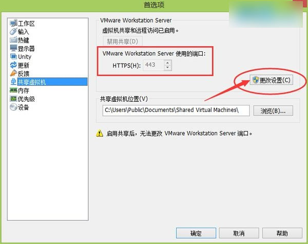 2、找到左側功能列表中的“共享虛擬機”,選擇后,在右側界面中點擊“更改設置”;