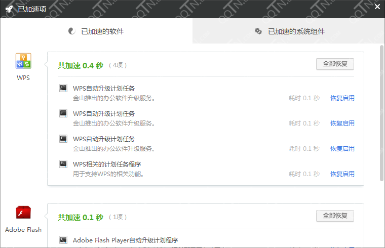 5、同時可以在下載進入已加速項管理,已經加速的軟件和已經加速的系統組件,可以在這恢復啟動