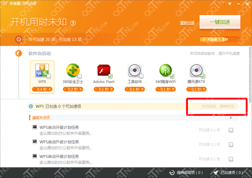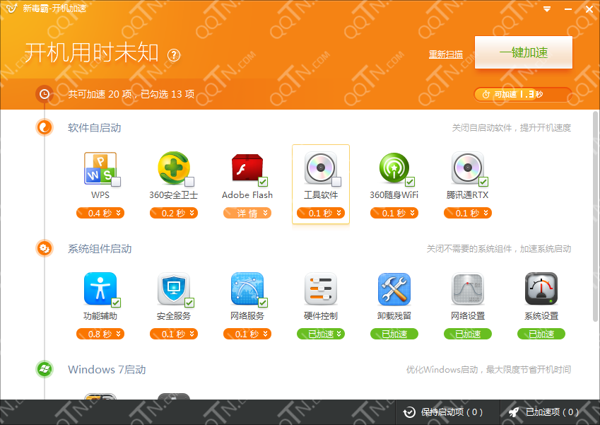 4、同時可以點擊一鍵加速,加速之后,會自動關閉一些無用的啟動項