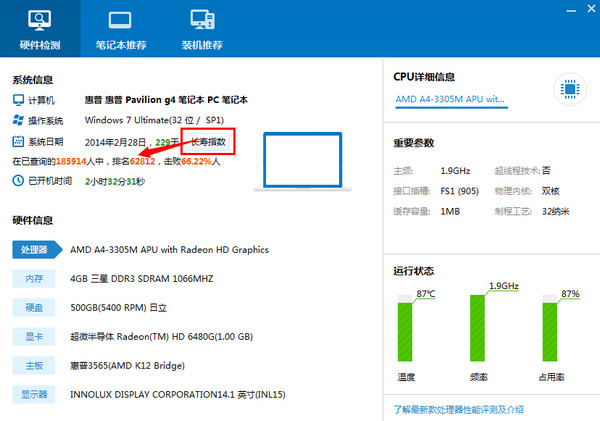 點擊如下圖的長壽指數按鈕,隨即列出你的系統安裝在已查詢的用戶中的排名情況,從圖片上看,小編的電腦在所有的用戶中排名62812,擊敗66.22%。
