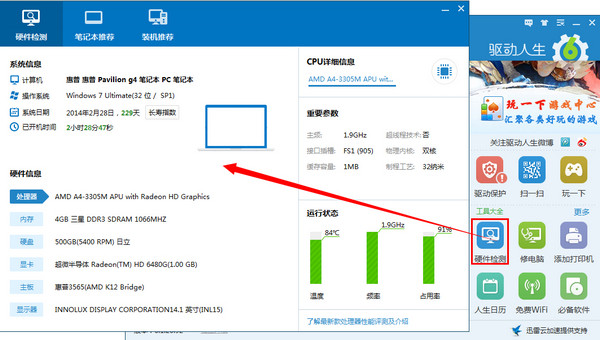那就是方法二:下載安裝驅動人生6。安裝成功后,打開軟件首頁右邊的硬件檢測即彈出如下圖的硬件檢測結果框,從圖片上我們可以看到小編的系統安裝于2014年2月28日,已安裝了229天。在此頁面上還可以看到更多的硬件信息和計算機的運行狀態等。