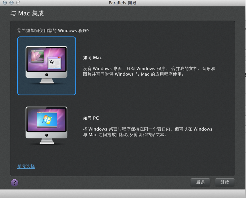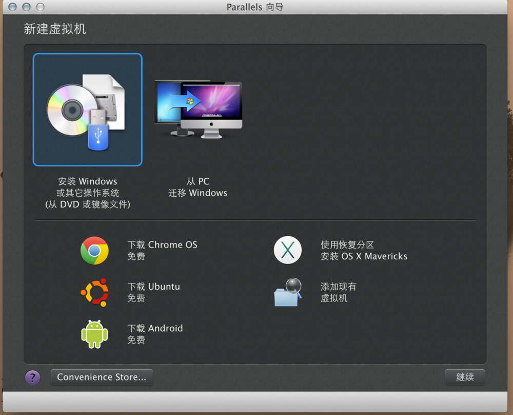 安裝完后出現(xiàn)Parallels向?qū)В@里我們選從DVD或者鏡像文件安裝。