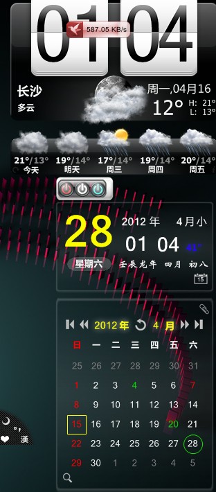 這邊的就是天氣預報始終以及萬年歷的小工具了~~~這些東西就比較簡單,大家在酷魚桌面的資源庫里下載好這樣的小工具然后設置一下時間地點啊什么的就可以了。。。圖中的迅雷亮了吧。