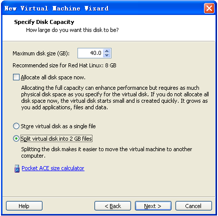 硬盤大小選擇為40GB,為了便于移植,此處將硬盤分裂成2GB大小的數據單元。