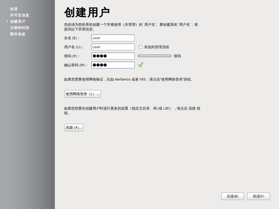 當到達創建用戶界面時,一定要設置一個用戶,否則會出現安裝的系統無法登陸的尷尬。
