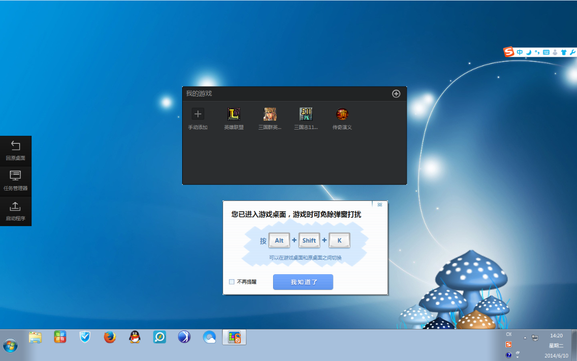 一秒進入清清爽爽的游戲桌面,這里只允許游戲和我們零距離接觸,其他亂七八糟的東西都揍凱!