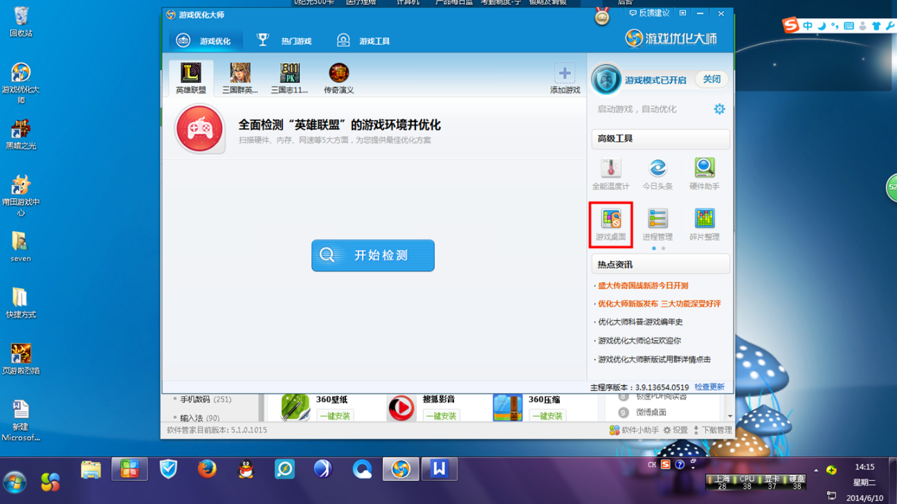 想在暴風(fēng)雨里來臨之前,痛痛快快的和隊友玩一場?快打開游戲優(yōu)化大師,點擊右邊高級工具——游戲桌面。