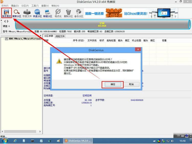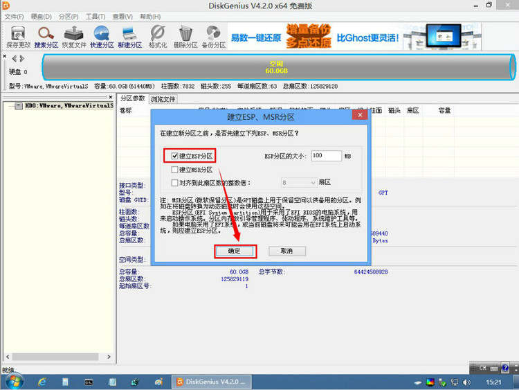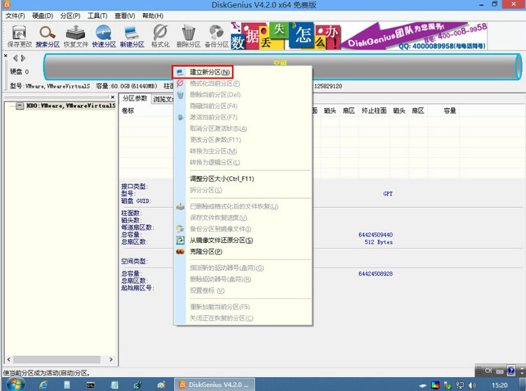 這里要注意的是,如果你當前硬盤已經(jīng)有數(shù)據(jù)了,且不想影響數(shù)據(jù),則請下載DiskGenius專業(yè)版,并運行64位專業(yè)版。因為PE里的DiskGenius是免費版,不支持在數(shù)據(jù)無損的情況下MBR轉GPT或GPT轉MBR。這里實驗的環(huán)境是空硬盤,所以直接建立GPT分區(qū)。如下圖: