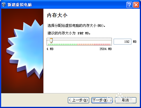 下一步,為虛擬電腦分配內存。分配內存要量力而行,我是按推薦、如果你的電腦是1G內存,那你就要少分一些內存,因為如果分出去的內存太多,電腦會卡。