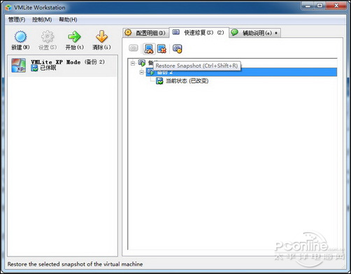 ◆ 用戶只需要在“VMLite XP Mode→菜單欄→控制→生成備份”中創建一個還原點,以后就可以在VMLite Workstation的“快速修復”中輕松還原到任意還原點,非常方便。