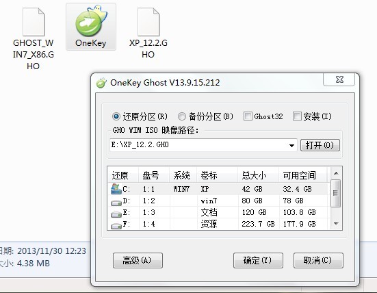 跟裝普通系統(tǒng)一樣,運行onekey,不過調(diào)整一下還原分區(qū),默認的還原C盤,現(xiàn)在咱們還原D盤