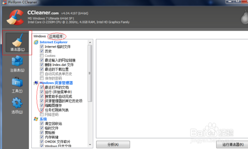 在打開了的CCleaner中,選擇“清潔器”,接著,對需要進行清理的windows和應用程序進行選擇,一般已經默認了很多需要清理的文件。
