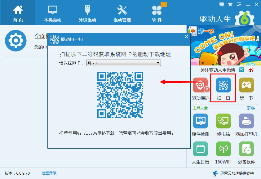 2、在另一臺安裝驅(qū)動人生的電腦上,利用驅(qū)動人生的掃一掃功能,將網(wǎng)卡驅(qū)動掃進(jìn)手機里,然后再傳到電腦上,直接安裝網(wǎng)卡驅(qū)動即可。