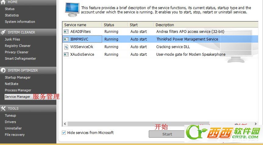 服務管理,以前用到服務管理的時候重要非常麻煩地去控制面板里找,現在有了這個優化軟件,你就可以直接來處理服務問題了,不過我建議大家盡量不要亂處理服務問題,除非你是高手知道你在做什么。