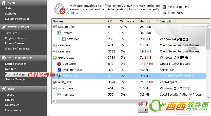 進程管理器,基本就是系統自帶的任務管理器,用來查看系統進程。一般在系統變慢或者比較卡的時候用它來看什么進程占用了你的系統資源,可以在這里把占用資源的進程終止掉。