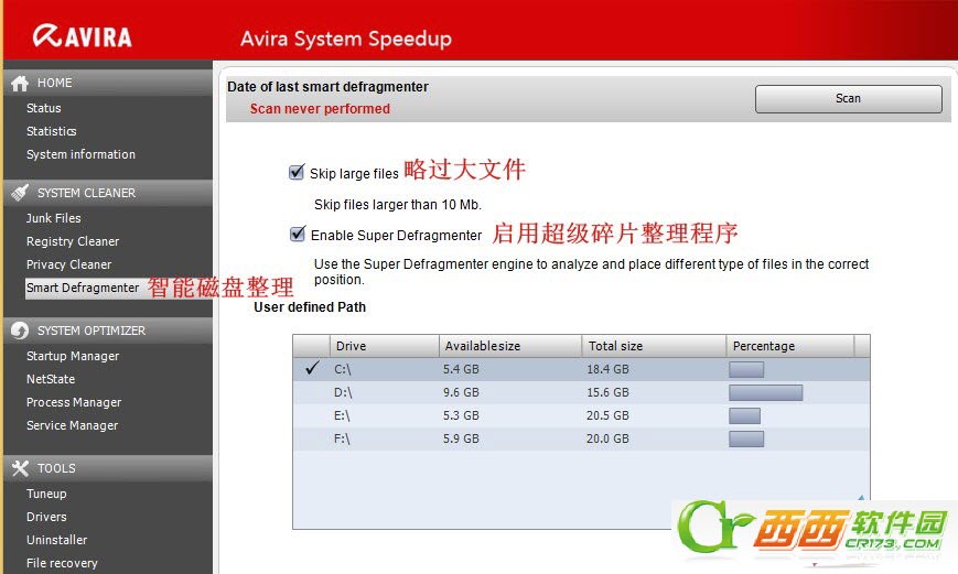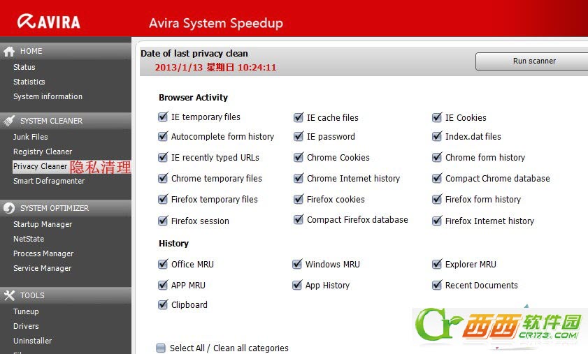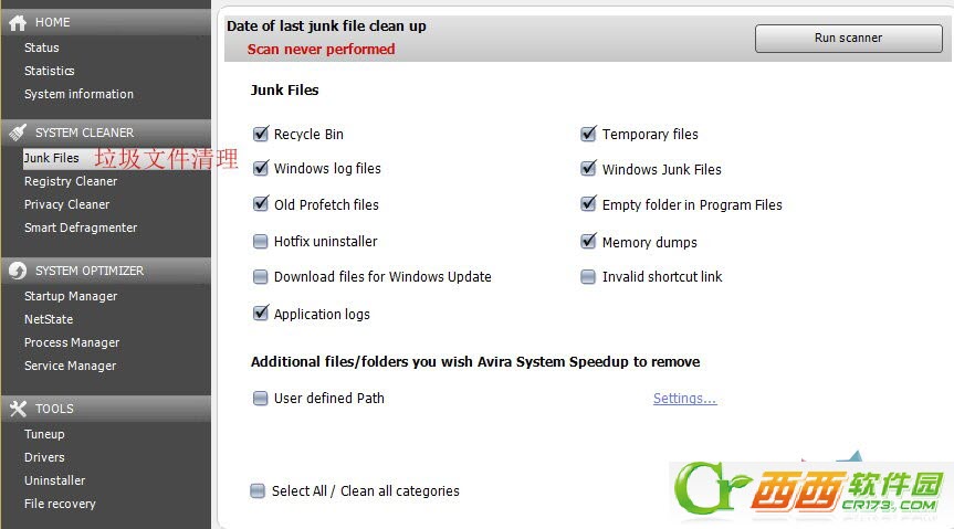 下面我們來看具體優化內容,首先是垃圾文件清理。在這個優化選項下,給出了常見的垃圾清理內容。常見的垃圾產生內容這里都有設定,用戶可根據自己的實際設置,我建議大家把這幾項全選上,因為Avira System Speedup的垃圾清理還算比較保守,沒有什么敏感的內容。