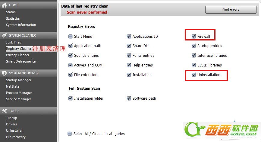 注冊表清理模塊相對來說是比較敏感的東西,一般我不建議大家進行清理,不過這款軟件的注冊表掃描大家還是可以放心用的,基本不會有什么問題。另外比較有特色的是對防火墻產生的注冊表垃圾進行清理,以及對卸載文件的垃圾清理。