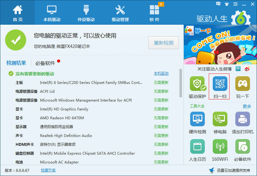 電腦沒有聯網的情況下,只要你的電腦有安裝驅動人生,就可以借助驅動人生來下載網卡驅動。打開驅動人生,在界面的右方有掃一掃的二維碼,直接點擊掃一掃。