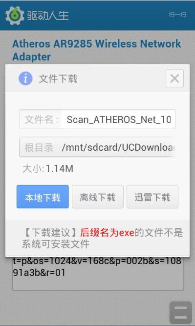掃描完成,識別成功之后,會出現一個驅動人生網卡驅動的下載頁面,這個就是網卡驅動了。溫馨提示:建議在WIFI環境下下載該網卡驅動,否則運營商可能會收取相關費用。點擊下載,選擇根目錄,再點擊本地下載,就可以將網卡驅動安裝包下載到手機上了。