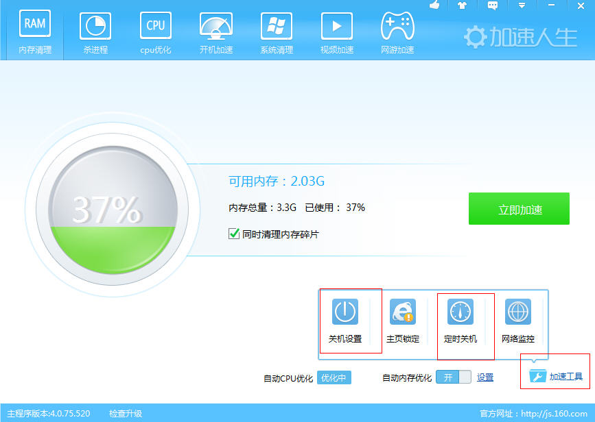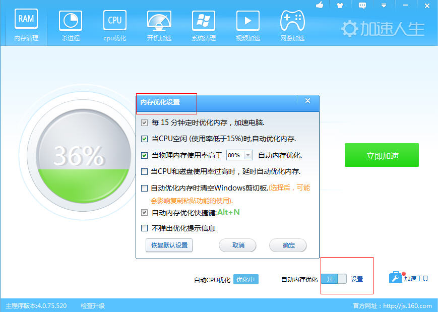 內存都去哪兒了?加速人生替您一鍵清理內存。打開加速人生的“內存清理”界面,立即加速清理。