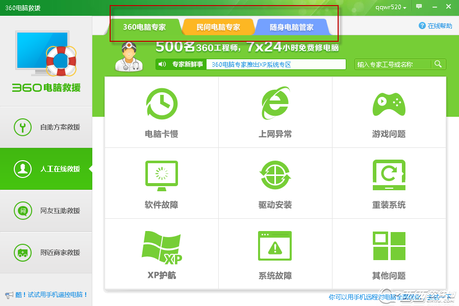 360電腦專家通過互聯網人工遠程一對一模式,為廣大網民提供系統與軟件維護服務,如病毒查殺、系統設置、疑難故障解決、數據恢復等!已有7000多個解決各類電腦問題的工具和教程,用戶只需點一個按鈕就能使電腦恢復正常,方便、實用、高效,從真正意義上實現了足不出戶免費修電腦!
