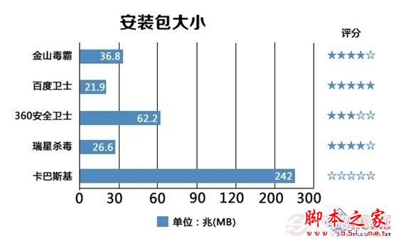 百度衛士因21.9M安裝包大小此輪獲勝,金山毒霸與瑞星殺毒也比較適中,卡巴斯基卻是驚人的242M。