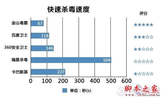 全盤掃描用戶并不會天天用,而快速殺毒也就成了最常用的掃描檢測系統重要位置安全性的方法,這個參數在實際應用中非常重要。本次金山毒霸再次以強勢奪冠,卡巴中規中矩,而瑞星成績墊底。