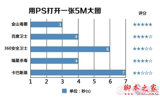 安全軟件安裝后最直觀的體驗就是實際操作了,這里我們使用PhotoShop打開一張5M的大圖作為參考。金山毒霸以微弱優勢獲勝,百度、瑞星緊隨其后,卡巴斯基墊底。