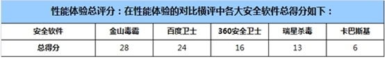 電腦開機進系統的速度是人們體驗最強、最直觀的實際體驗了,本輪對比中金山毒霸以微弱的優勢戰勝百度獲得第一,瑞星墊底。