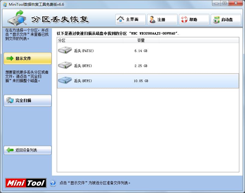 注意:如果在顯示列表中沒有找到目標分區,請點擊“完全掃描”按鈕對硬盤進行全面掃描,然后再找到并選中目標分區。