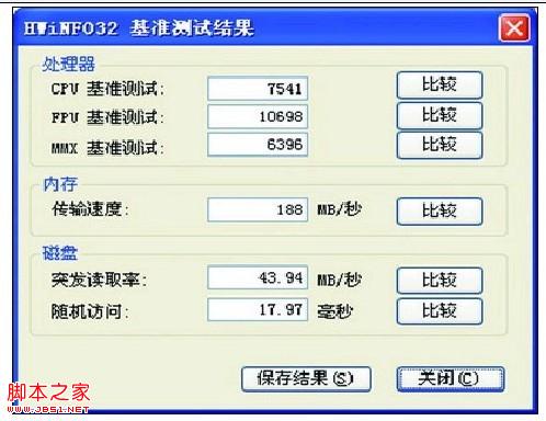 點擊工具欄上的"基準檢測"按鈕就可以對CPU,硬盤,內存的具體性能進行檢測,如下圖.點擊對應項目欄的"比較"按鈕,還會顯示與同類硬件相比較得值,使我們對當前所使用的硬件性能有一個直觀的認識.