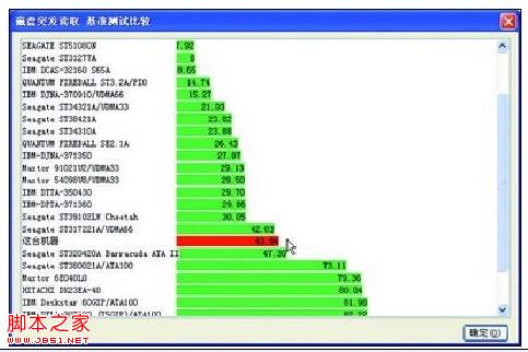 比如點擊磁盤"突發讀取率"右側的"比較"按鈕,就會得到如下圖所示的窗口.如果點擊工具欄上的"報告"按鈕,我們還能得到所選測試項目的詳細報告說明.